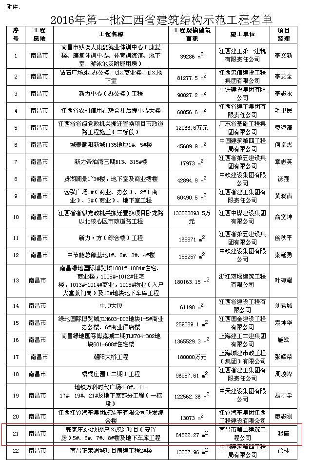 由南昌市第二建筑工程公司承建的郭家莊B地塊棚戶區(qū)改造項目(安置房)5#、6#、7#、8#樓及地下車庫工程獲“2016年第一批江西省建筑結構示范工程” [摘自贛建質(zhì)監(jiān)字[2016]1號]。