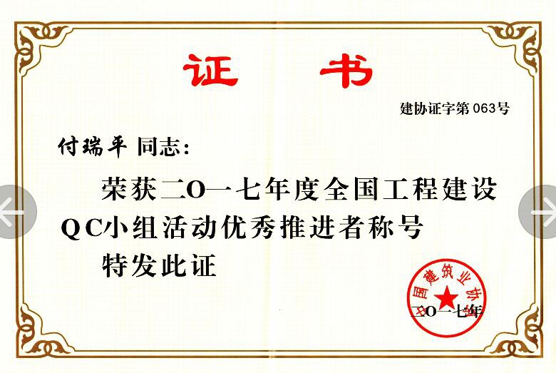 在中國建筑業(yè)協(xié)會組織的2017年度QC成果發(fā)布會上,公司QC小組的《提高GC發(fā)泡水泥保溫板外墻外保溫施工質(zhì)量》成果榮獲2017年度全國工程建設(shè)質(zhì)量管理小組活動優(yōu)秀成果獎;付瑞平同志榮獲2017年度全國工程建設(shè)QC小組活動優(yōu)秀推進者稱號。